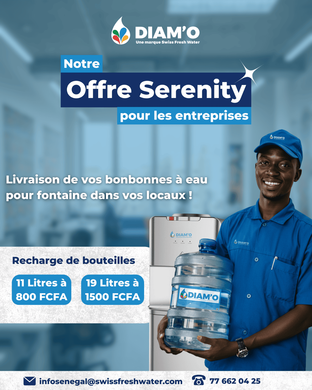 Avec l’offre SERENITY, nous vous proposons des bonbonnes de 11L et 19L d'eau filtrée et purifiée. Vous n’avez plus besoin de vous déplacer pour aller les chercher car DIAM’O vous livre directement dans vos bureaux.